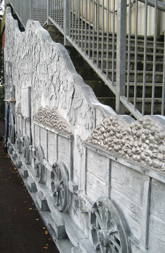 The artwork uses the steam billowing out of the Loco to completely cover the unsightly bridge steps. 400 Children from nearby schools designed the individual leaves blowing within the steam. Fabricated from galvanised steel with an etched finish.